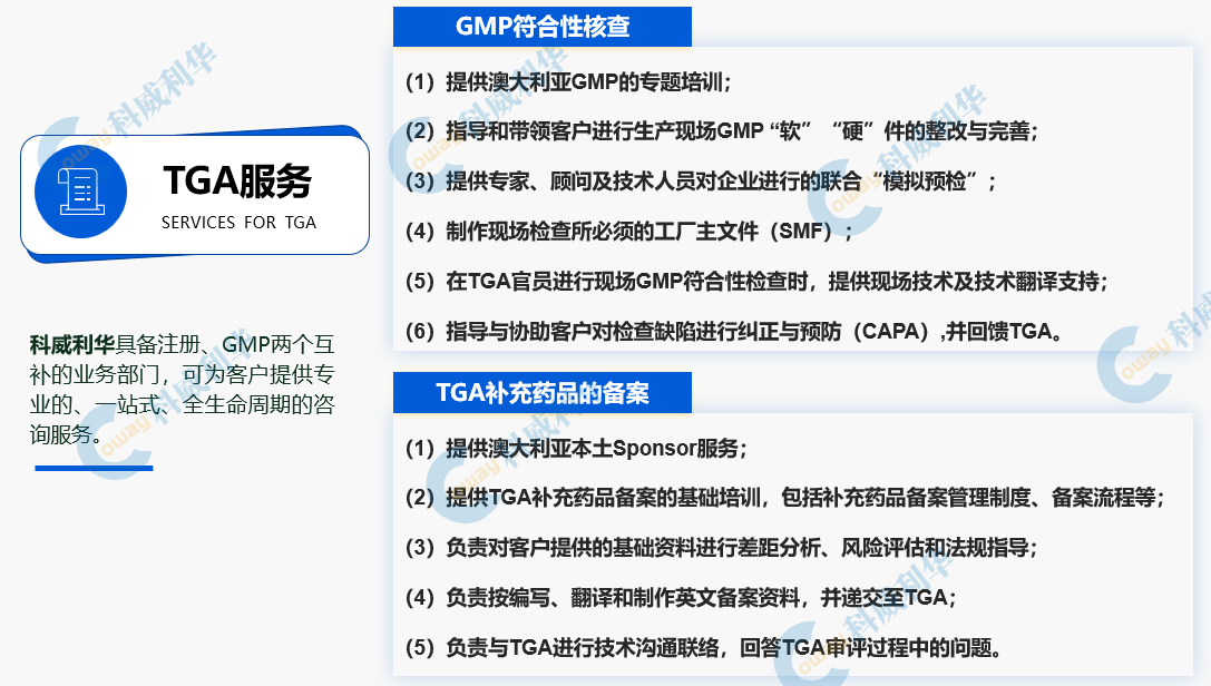 为补充药品(Complementary Medicine, CM)在澳大利亚(Therapeutic Goods Administration, TGA)的备案(List)及后续维护提供专业的、全生命周期的注册、GMP咨询服务。