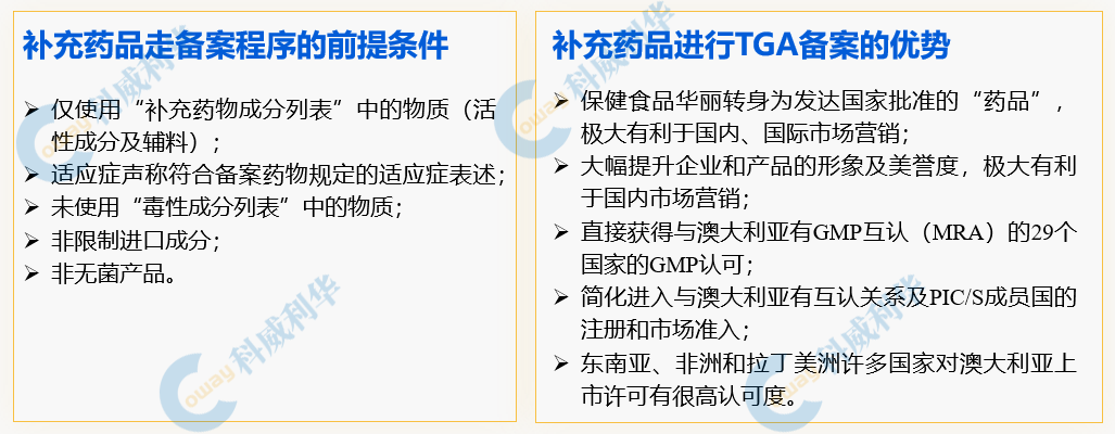 补充药品(Complementary Medicine, CM)是指其成分是天然的、有应用传统的、对人体的结构和功能有正向影响、使用安全的产品,而中草药、维生素、氨基酸、矿物质等是补充药物的主体。补充药品在澳大利亚的上市申请有 “注册(Register)”程序和“备案(List)”程序两种,而绝大多数补充药品适用于相对简单的“备案(List)”程序。通过GMP符合性检查,并通过TGA按备案程序的评审,补充药品即可在澳大利亚获得上市批准。